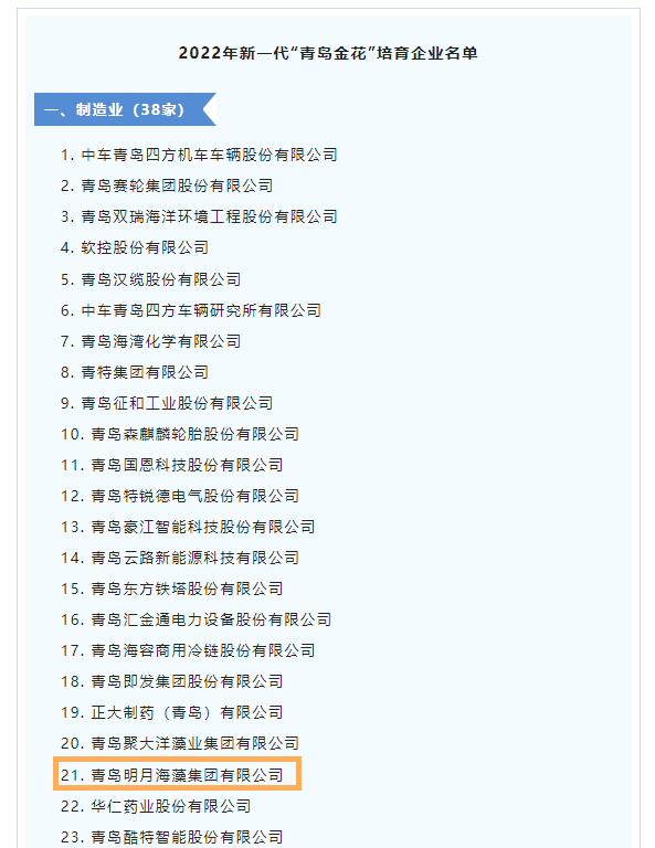 近日,從市工業和信息化局獲悉,青島明月海藻集團榮獲2022年新一代“青島金花”培育企業稱號,這是我集團連續四年獲此殊榮。據悉,該項榮譽由市工業和信息化局牽頭遴選,旨在遴選一批在行業中具有明顯規模優勢和競爭優勢、擁有高品牌知名度和品牌價值的企業,充分發揮企業的品牌影響力和主體作用,促進企業做大做強,推進產業創新發展。