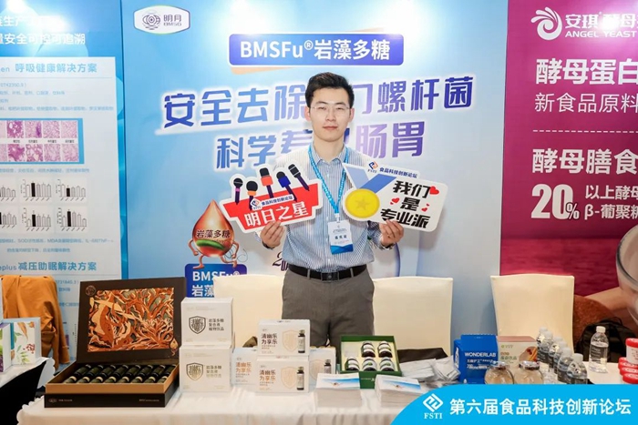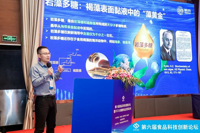 青島明月海藻生物健康科技集團(tuán)副總裁孫占一,在功能食品論壇上分享了海洋創(chuàng)新型原料巖藻多糖在去除幽門螺桿菌、改善胃腸道、提高免疫力方面的健康功效。