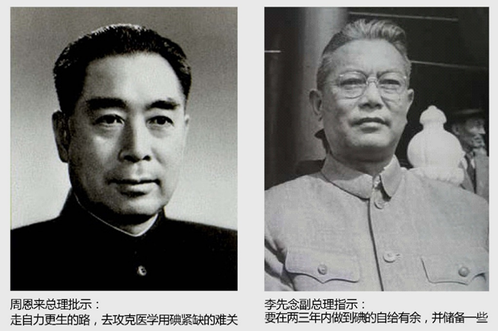 上世紀 60 年代 ,是一個嚴重缺碘的年代。碘是國家的重要戰略物資,對于國計民生有著舉足輕重的作用。新中國成立后,我國所需要的碘基本依賴進口。隨著“冷戰”的加劇,西方國家對我國實行經濟封鎖,并采取“禁運”政策中斷了我國碘的來源。為了打破“封鎖”,從根本上改變我國缺碘的嚴峻形勢,周恩來總理作出重要批示:“走自力更生的道路,去攻克醫學用碘緊缺的難關?!崩钕饶罡笨偫碇甘荆骸耙趦扇陜茸龅降獾淖越o有余,并儲備一些?!?