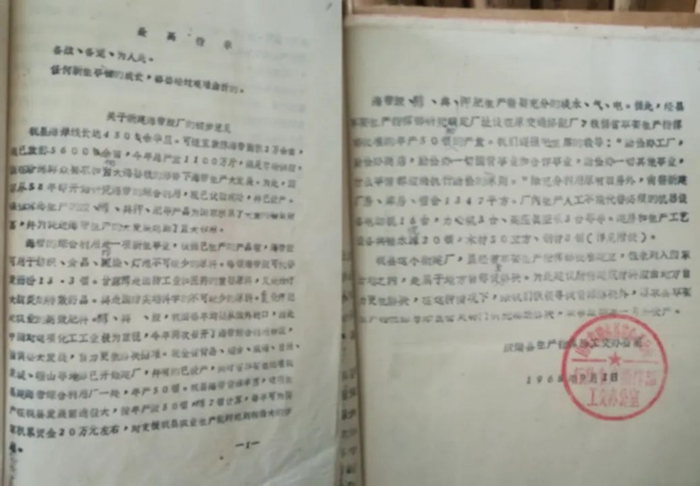 1968 年 8 月,作為一項重要的國家戰略任務,在中央的扶持下,在山東省委、省政府和昌濰地委、行署的支持下,膠南縣海洋化工廠開始籌建,廠址選定膠南縣駐地王戈莊,首任廠長張仁仕。建廠的規劃藍圖,是建立以海帶制碘為主的綜合性海藻加工企業。建廠的原旨,在于提取“碘”,防治當時頻發的碘缺乏病,俗稱“大脖子病”,最初的設計能力為年產碘 1 噸。