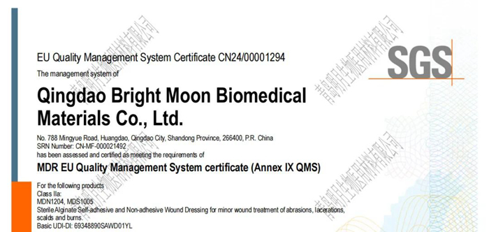 近日,青島明月生物醫用材料有限公司的代表產品“藻酸鹽無菌傷口敷料”獲得通標標準技術服務有限公司(以下簡稱“SGS”)簽發的歐盟MDR證書,這是醫用材料獲得的第一張歐盟MDR證書,也是SGS在藻酸鹽敷料領域頒發的第一張無源ⅡA類醫療器械MDR證書。