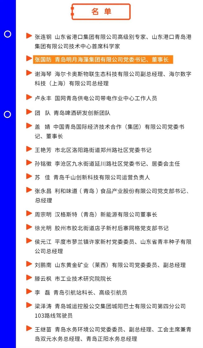 按照省委組織部部署,圍繞“十大創(chuàng)新”工作重點(diǎn),青島市從4月份啟動了2022年“發(fā)現(xiàn)榜樣”活動,全市擬確定“創(chuàng)新榜樣”團(tuán)隊(duì)2個(gè)、黨員20名。7月12日,青島市“創(chuàng)新榜樣”名單公示,其中,青島明月海藻集團(tuán)董事局主席張國防入選。