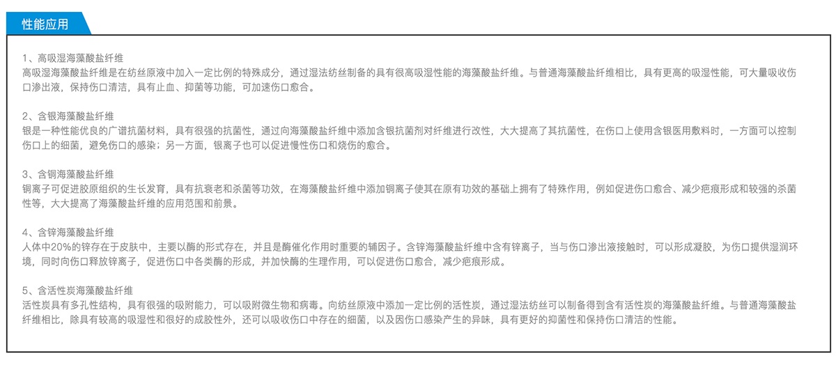 在普通海藻酸鹽纖維生產工藝的基礎上,通過向紡絲原液中添加各種活性成分,包括銀、銅、鋅、活性炭等,以達到對海藻酸鹽纖維改性的目的,提高了其各項性能指標,具有更廣闊的應用前景和更優異的護理效果。